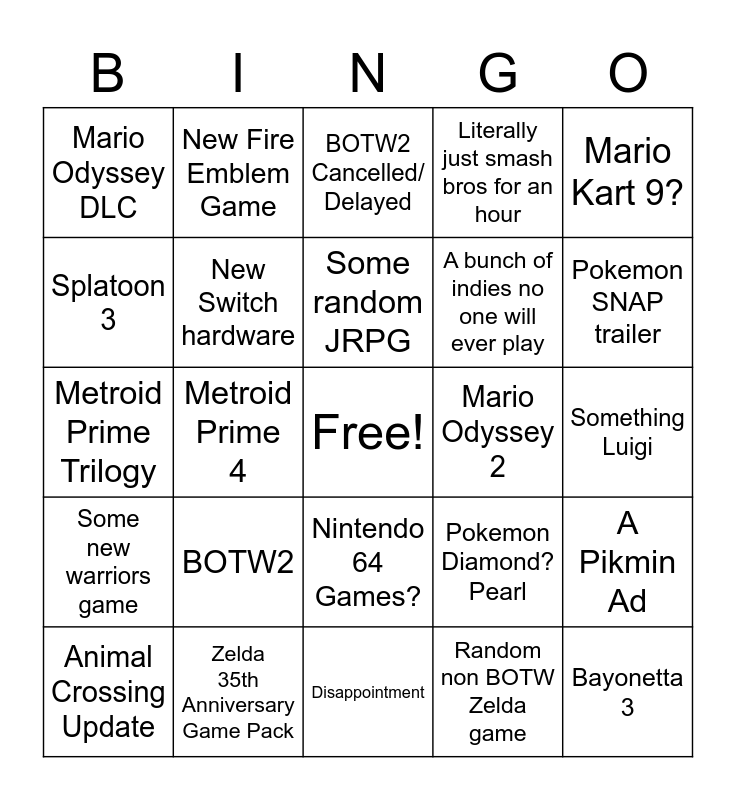 This bingo card has a free space and 24 words: BOTW2, Zelda 35th Anniversary Game Pack, Some random JRPG, Animal Crossing Update, Mario Kart 9?, Mario Odyssey DLC, Splatoon 3, New Fire Emblem Game, Mario Odyssey 2, Nintendo 64 Games?, A bunch of indies no one will ever play, Metroid Prime Trilogy, Pokemon Diamond?Pearl, A Pikmin Ad, New Switch hardware, Random non BOTW Zelda game, Something Luigi, BOTW2 Cancelled/ Delayed, Pokemon SNAP trailer, Metroid Prime 4, Bayonetta 3, Some new warriors game, Literally just smash bros for an hour and Disappointment.