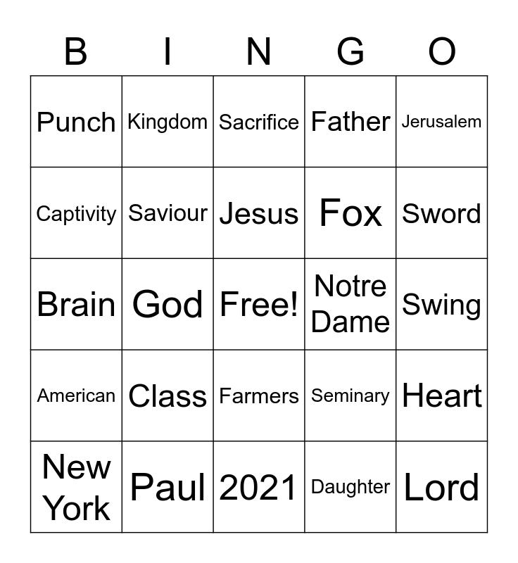 This bingo card has a free space and 40 words: Heroes, Brain, House, Saviour, Paul, Farmers, Jesus, Blessed, Jerusalem, American, God, Father, Lord, Swing, Notre Dame, Class, Family, Punch, Trowel, Sacrifice, Heart, Daughter, Fox, Captivity, Samaria, British, Altar, Faith, Rejoice, Colonies, Peter, New York, French, Seminary, Sword, 2021, Real Life Church, Glad, Kingdom and Heaven.