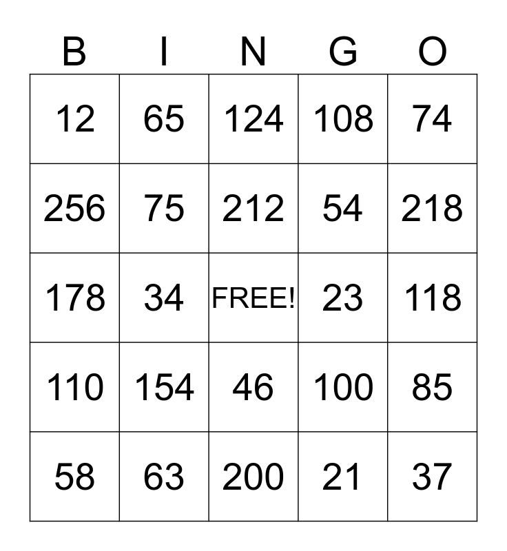 This bingo card has a free space and 24 words: 154, 63, 212, 58, 74, 12, 256, 65, 23, 46, 54, 178, 100, 85, 75, 21, 118, 124, 218, 34, 37, 110, 108 and 200.