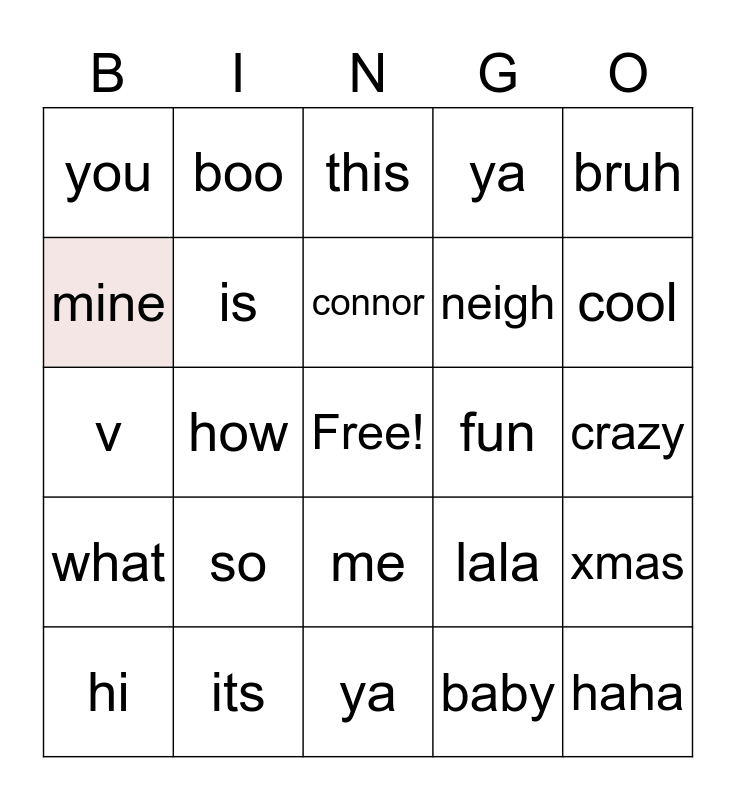 This bingo card has a free space and 29 words: hi, there, how, are, you, this, is, so, fun, its, crazy, haha, ya, baby, cool, bride, me, what, bruh, v, lala, na, neigh, mine, ya, boo, xmas, connor and mankato.