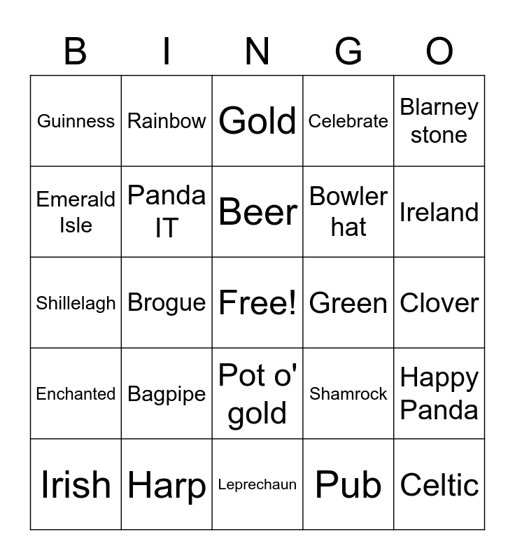This bingo card has a free space and 38 words: Panda love, BigPanda, Panda, Panda IT, Happy Panda, Bagpipe, Beer, Beer glass, Blarney stone, Bowler hat, Brogue, Celebrate, Celtic, Clover, Emerald Isle, Enchanted, Four-leaf clover, Gold, Good luck, Green, Guinness, Harp, Ireland, Irish, Jig, Leprechaun, Limerick, Luck o' the Irish, Lucky Charms, Magical, Mischief, Pot o' gold, Pub, Rainbow, Saint, Shamrock, Shillelagh and St. Paddy's Day.