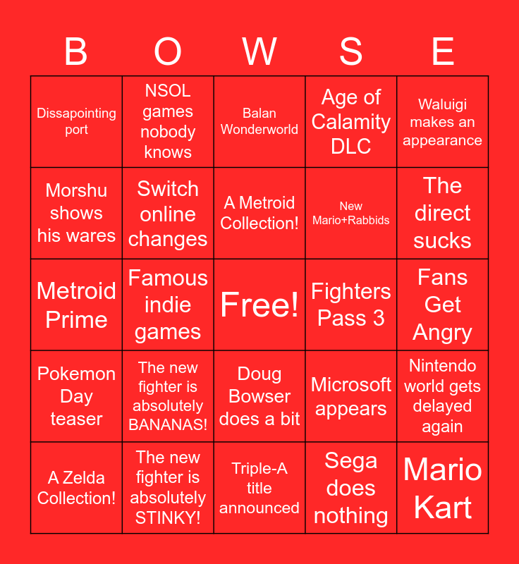 This bingo card has a free space and 24 words: The new fighter is absolutely BANANAS!, The new fighter is absolutely STINKY!, A Metroid Collection!, A Zelda Collection!, Waluigi makes an appearance, Dissapointing port, Morshu shows his wares, NSOL games nobody knows, Fighters Pass 3, Doug Bowser does a bit, New Mario+Rabbids, Metroid Prime, Microsoft appears, Nintendo world gets delayed again, Switch online changes, Sega does nothing, Fans Get Angry, Balan Wonderworld, The direct sucks, Famous indie games, Mario Kart, Pokemon Day teaser, Age of Calamity DLC and Triple-A title announced.