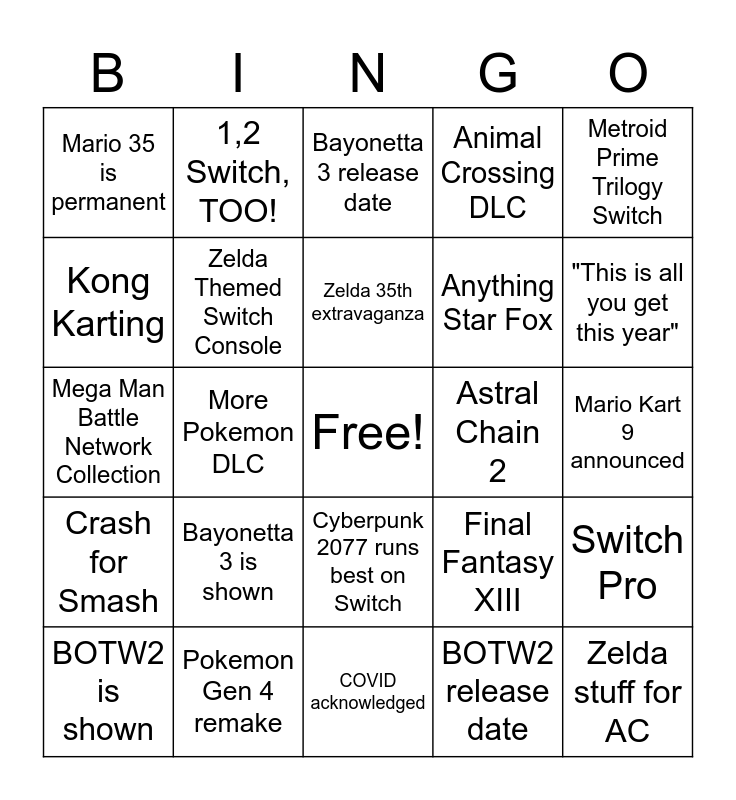 This bingo card has a free space and 24 words: Bayonetta 3 is shown, Pokemon Gen 4 remake, Zelda 35th extravaganza, BOTW2 is shown, Metroid Prime Trilogy Switch, Mario 35 is permanent, Kong Karting, 1,2 Switch, TOO!, Astral Chain 2, Cyberpunk 2077 runs best on Switch, Anything Star Fox, Mega Man Battle Network Collection, Final Fantasy XIII, Switch Pro, Zelda Themed Switch Console, BOTW2 release date, Mario Kart 9 announced, Bayonetta 3 release date, "This is all you get this year", More Pokemon DLC, Zelda stuff for AC, Crash for Smash, Animal Crossing DLC and COVID acknowledged.