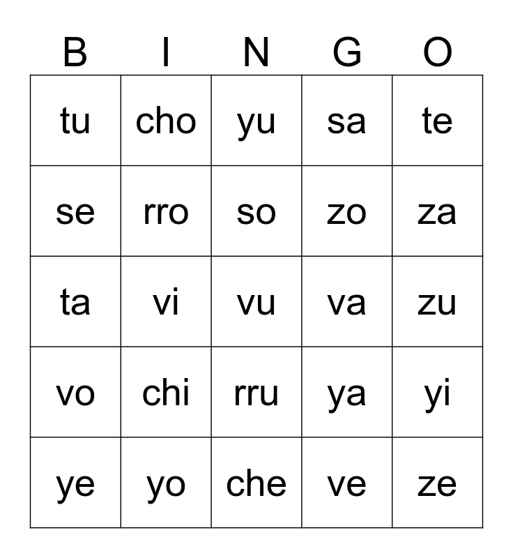 This bingo card has 35 words: rra, rre, rri, rro, rru, sa, se, si, so, su, ta, te, ti, to, tu, va, ve, vi, vo, vu, ya, ye, yi, yo, yu, za, ze, zi, zo, zu, cha, che, chi, cho and chu.