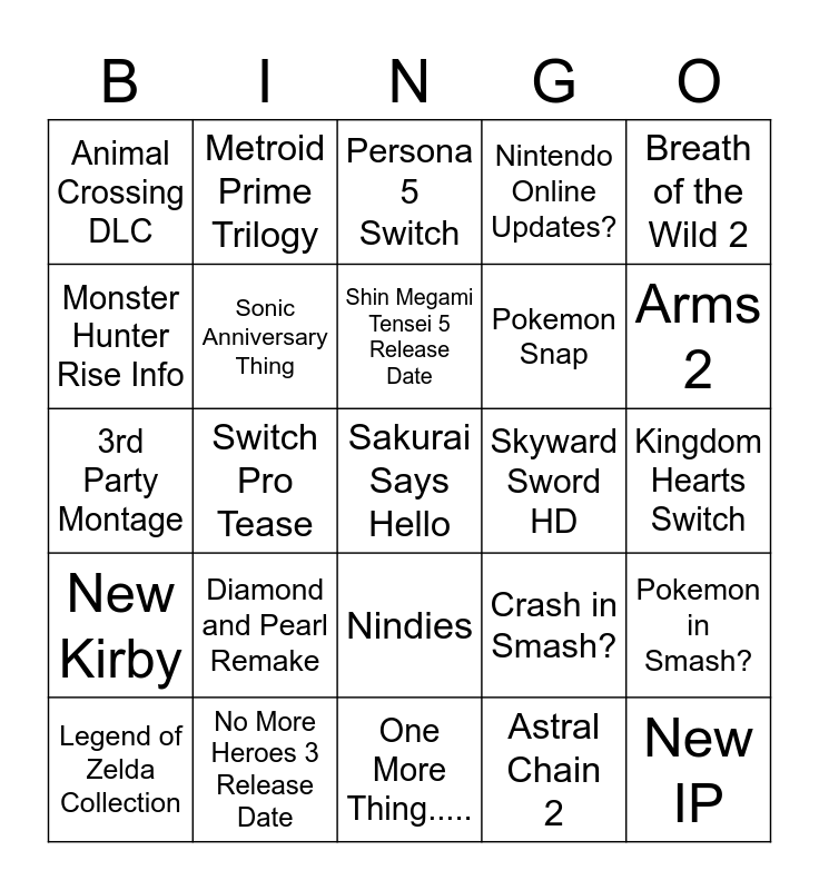 This bingo card has a free space and 24 words: Diamond and Pearl Remake, No More Heroes 3 Release Date, Shin Megami Tensei 5 Release Date, Legend of Zelda Collection, Breath of the Wild 2, Animal Crossing DLC, Monster Hunter Rise Info, Metroid Prime Trilogy, Skyward Sword HD, Nindies, Pokemon Snap, 3rd Party Montage, Crash in Smash?, Pokemon in Smash?, Sonic Anniversary Thing, Astral Chain 2, Kingdom Hearts Switch, Persona 5 Switch, Arms 2, Switch Pro Tease, New IP, New Kirby, Nintendo Online Updates? and One More Thing......