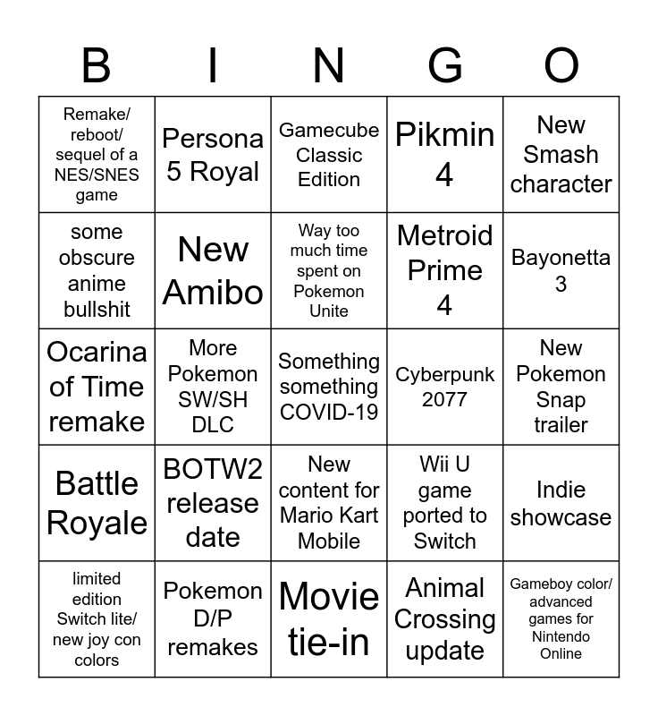 This bingo card has a free space and 24 words: BOTW2 release date, Pokemon D/P remakes, Way too much time spent on Pokemon Unite, limited edition Switch lite/ new joy con colors, New Smash character, Remake/ reboot/ sequel of a NES/SNES game, some obscure anime bullshit, Persona 5 Royal, Cyberpunk 2077, New content for Mario Kart Mobile, Metroid Prime 4, Ocarina of Time remake, Wii U game ported to Switch, Indie showcase, New Amibo, Animal Crossing update, New Pokemon Snap trailer, Gamecube Classic Edition, Bayonetta 3, More Pokemon SW/SH DLC, Gameboy color/ advanced games for Nintendo Online, Battle Royale, Pikmin 4 and Movie tie-in.