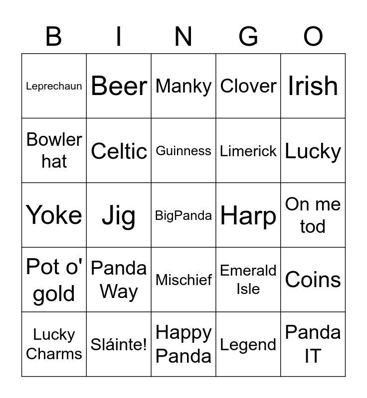 This bingo card has a free space and 46 words: Love Pandas, Panda IT, Panda Fun, Happy Panda, Panda Way, Bagpipe, Beer, Blarney stone, Bowler hat, Brogue, Celtic, Clover, Coins, Emerald Isle, 4 leaf clover, Green, Guinness, Harp, Ireland, Irish, Jig, Legend, Leprechaun, Limerick, Luck o' the Irish, Lucky, Lucky Charms, Magic, Mischief, Pot o' gold, Pub, Rainbow, Saint, Shamrock, St. Paddy's Day, Sláinte!, On me tod, Up to 90, Slagging, Banjaxed, Minus craic, Manky, Yoke, Culchie, Faffing and Dryshite.