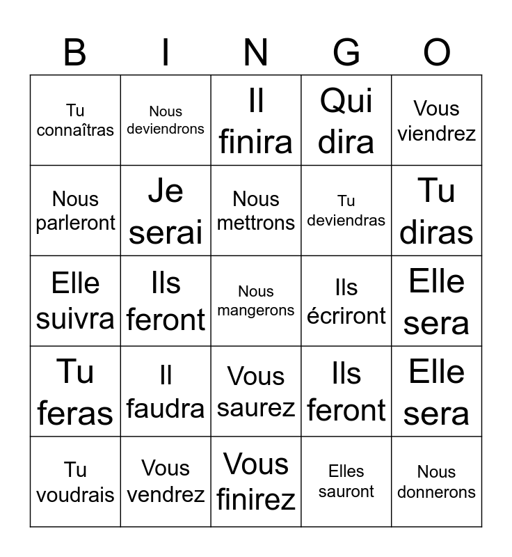 This bingo card has a free space and 34 words: Elles auront, Elles sauront, Nous lirons, Vous irez, Tu feras, Je serai, Vous viendrez, Tu voudrais, Nous deviendrons, Qui pourra, Nous mettrons, Il finira, Je verrai, Tu prendras, Ils écriront, Tu diras, Vous vendrez, Elle suivra, Il faudra, Ils feront, Vous saurez, Nous aurons, Tu connaîtras, Elle sera, Vous finirez, Nous donnerons, Qui dira, Il faudra, Tu deviendras, Nous parleront, Tu iras, Ils feront, Elle sera and Je lirai.
