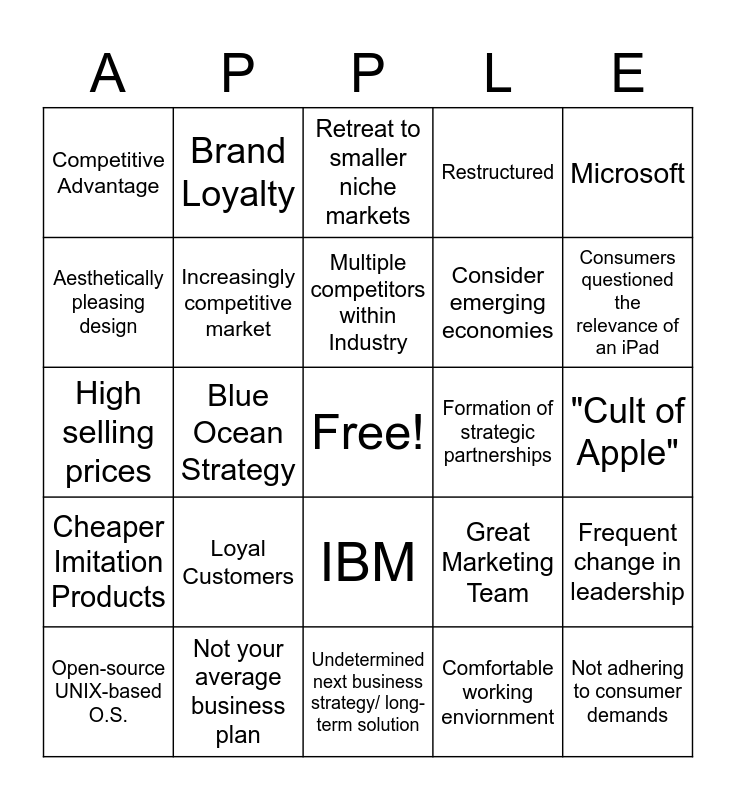 This bingo card has a free space and 27 words: Great Marketing Team, Loss of Steve Job, Consider emerging economies, Undetermined next business strategy/ long-term solution, Aesthetically pleasing design, Retreat to smaller niche markets, Brand Loyalty, Cheaper Imitation Products, Formation of strategic partnerships, Frequent change in leadership, High selling prices, Restructured, Open-source UNIX-based O.S., Not your average business plan, Consumers questioned the relevance of an iPad, Continual implementation of next generation products, Increasingly competitive market, Multiple competitors within Industry, Loyal Customers, Competitive Advantage, "Cult of Apple", Comfortable working enviornment, Blue Ocean Strategy, Not adhering to consumer demands, IBM, Microsoft and Sculley got Jobs thrown out.