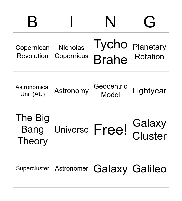 This bingo card has 22 words: Astronomer, Heliocentric Model, Nicholas Copernicus, Johannes Kepler, Astronomy, Geocentric Model, Copernican Revolution, Tycho Brahe, Free!, Galileo, The Big Bang Theory, Planetary Rotation, Orbit, Solar System, Galaxy, Milky Way Galaxy, Galaxy Cluster, Supercluster, Universe, Astronomical Unit (AU), Lightyear and Observable Universe.