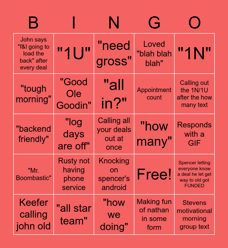 This bingo card has 25 words: Rusty not having phone service, "how we doing", "all in?", Keefer calling john old, "1N", John says "f&I going to load the back" after every deal, "tough morning", "1U", "how many", Knocking on spencer's android, Appointment count, "backend friendly", Free!, Spencer letting everyone know a deal he let get way to old got FUNDED, "Good Ole Goodin", Stevens motivational morning group text, Responds with a GIF, "need gross", Calling out the 1N/1U after the how many text, "log days are off", Calling all your deals out at once, "all star team", "Mr. Boombastic", Loved "blah blah blah" and Making fun of nathan in some form.