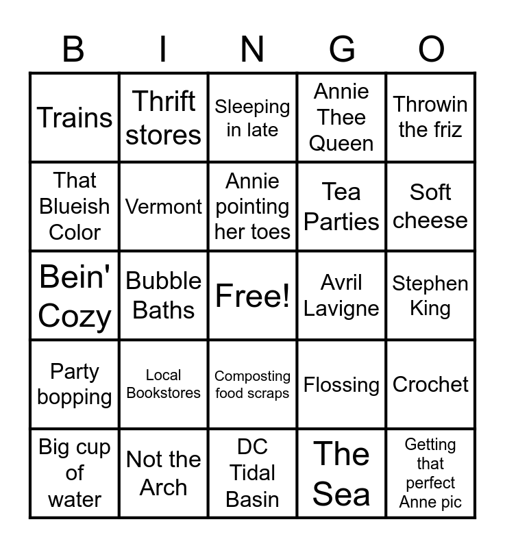 This bingo card has a free space and 70 words: Joan Didion, Stephen King, Virginia Woolf, Jane Austen, Not the Arch, Instagram kittens, Annie Thee Queen, Ducks, Throwin the friz, Floor-length sweaters, Crochet, Waking up early, Trains, Sleeping in late, Lavender Soap, Bubble Baths, Composting food scraps, Tea Parties, Rosé in Prospect Park, Party bopping, Avril Lavigne, Flossing, Soft cheese, Sushi, Public and/or human-powered transportation, Getting her work done early, Swimming, Mermaids, The Sea, Hammocks, Thrift stores, Sundresses, Taylor Swift, Grape Leaves, Tom Brady, Reusable takeout containers, Brothers Hummus, Baby Chloe, Baby Niece Madelyn, That Blueish Color, Chopping tomatoes, Local Bookstores, Getting that perfect Anne pic, Sheer curtains billowing in the wind, Boats, Vermont, Big cup of water, Peeing outside, Spoonfuls of peanut butter, Floral prints, Houseplants with personality, Fish tacos, Sleepytime Tea, Squam Lake, DC Tidal Basin, Annie's Paws, Annie pointing her toes, Farmer's Markets, National Parks, Pistachio Ice Cream, Bein' Cozy, Alaska, Sardines, Hot Toddy, Fancy Toast, Ira Glass, Dancing!, Pretty Views, Ghosts and Smelling Her Hair.
