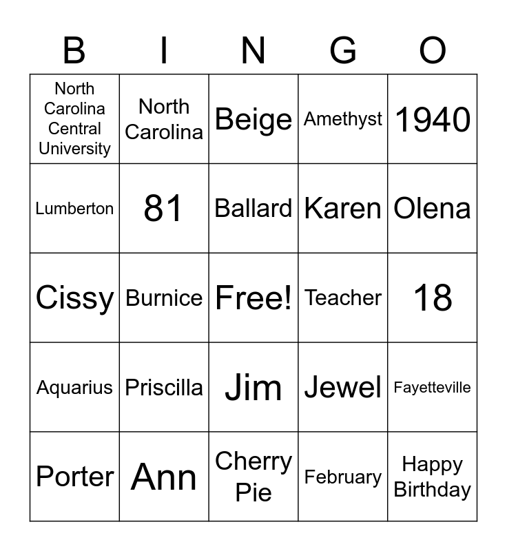 This bingo card has a free space and 24 words: Priscilla, Ann, Ballard, Porter, 1940, North Carolina Central University, Lumberton, North Carolina, Teacher, Jim, Karen, Cissy, Jewel, Fayetteville, 81, February, 18, Beige, Olena, Burnice, Happy Birthday, Aquarius, Amethyst and Cherry Pie.