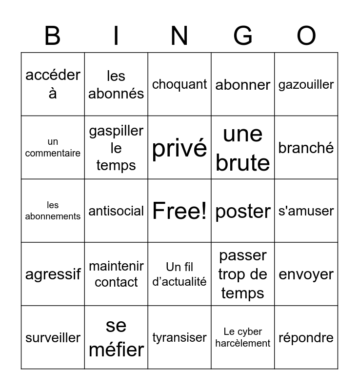 This bingo card has a free space and 36 words: accro à, disponible, avoir influence sur, gaspiller le temps, passer trop de temps, agressif, privé, chatter, gazouiller, partager, antisocial, abonner, s'informer, poster, branché, accéder à, communiquer, maintenir contact, répondre, choquant, s'amuser, envoyer, se méfier, surveiller, tyransiser, les abonnés, les abonnements, une appli, une brute, un commentaire, le comportement, les désordres psychologiques, Le cyber harcèlement, Un fil d’actualité, Un geek and Les internautes.