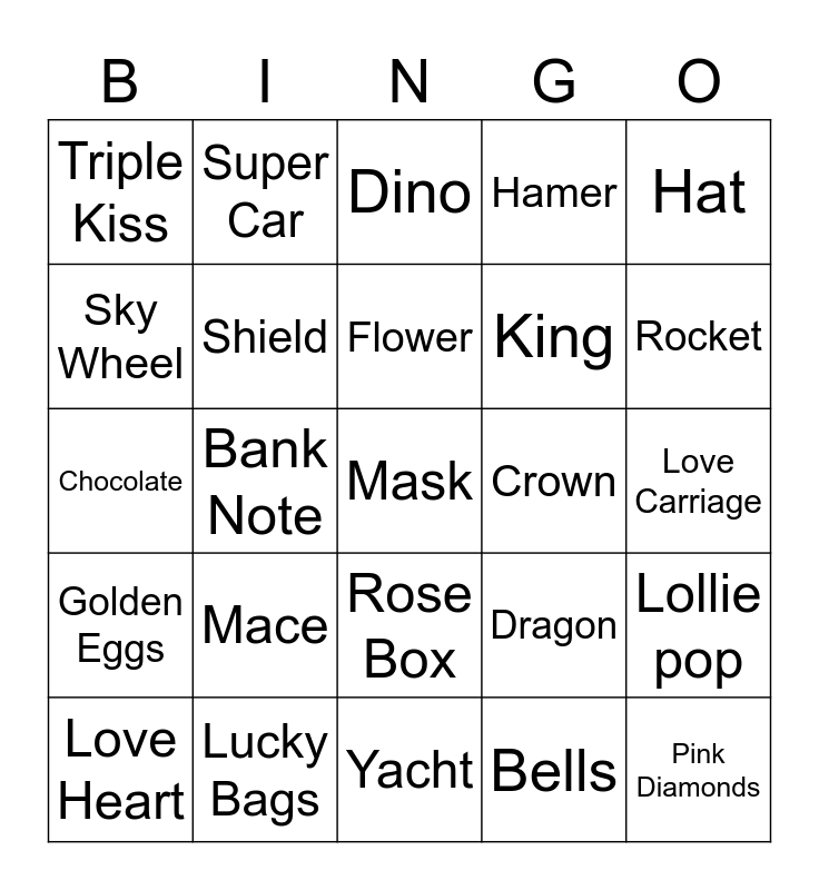 This bingo card has 25 words: Mace, Yacht, Flower, Love Heart, Hat, Triple Kiss, Sky Wheel, Super Car, Crown, Rose Box, King, Chocolate, Dragon, Lollie pop, Shield, Pink Diamonds, Love Carriage, Dino, Rocket, Bank Note, Mask, Lucky Bags, Golden Eggs, Hamer and Bells.