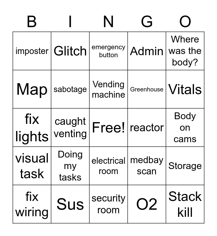 This bingo card has a free space and 30 words: Sus, Self-report, caught venting, crewmate, imposter, emergency button, sabotage, electrical room, reactor, security room, Body on cams, Stack kill, O2, Communication rooms, Vitals, Admin card swipe, medbay scan, visual task, Doing my tasks, Where was the body?, fix lights, check vitals, Glitch, Greenhouse, Map, Admin, Storage, fix wiring, Vending machine and navigation.