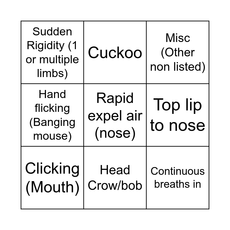 This bingo card has 14 words: Hissing (S's), Eyebrows, Clicking (Mouth), Cuckoo, Hand flicking (Banging mouse), Rapid expel air (nose), Continuous breaths in, Shoulders (1 or both), Head Crow/bob, Sudden Rigidity (1 or multiple limbs), Pull Face, Top lip to nose, Misc (Other non listed) and Sudden Twitching.