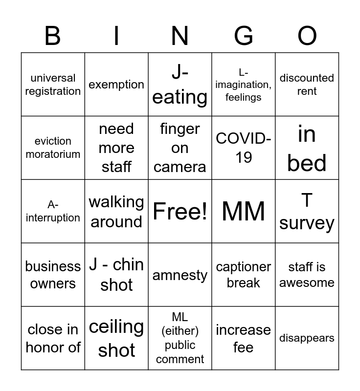 This bingo card has a free space and 24 words: J - chin shot, ceiling shot, finger on camera, close in honor of, discounted rent, universal registration, eviction moratorium, exemption, MM, amnesty, COVID-19, A-interruption, captioner break, staff is awesome, need more staff, increase fee, T survey, J-eating, in bed, walking around, disappears, business owners, L-imagination, feelings and ML (either) public comment.