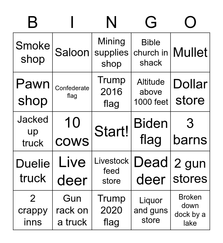 This bingo card has a free space and 24 words: Live deer, Gun rack on a truck, Trump 2016 flag, 2 crappy inns, Mullet, Smoke shop, Pawn shop, Saloon, Biden flag, Livestock feed store, Altitude above 1000 feet, Jacked up truck, Dead deer, 2 gun stores, Confederate flag, Liquor and guns store, 3 barns, Mining supplies shop, Dollar store, 10 cows, Broken down dock by a lake, Duelie truck, Bible church in shack and Trump 2020 flag.