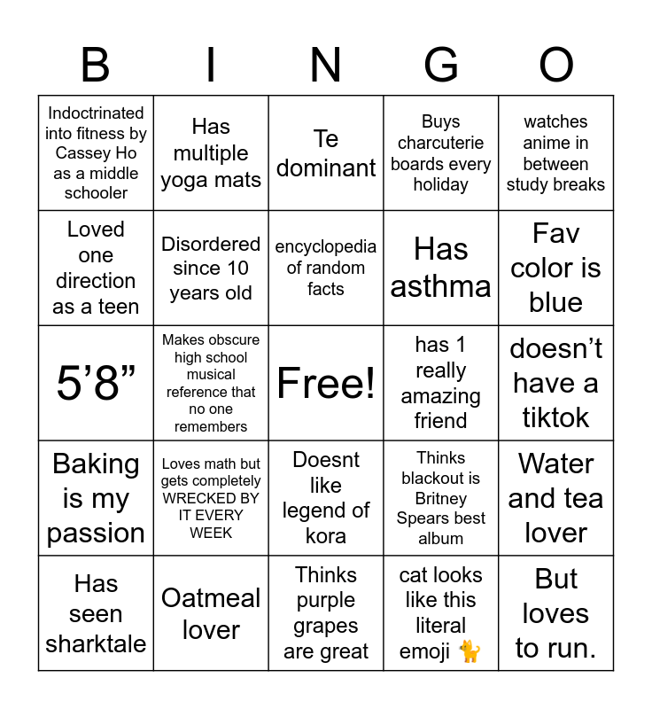 This bingo card has a free space and 24 words: Has seen sharktale, Loves math but gets completely WRECKED BY IT EVERY WEEK, encyclopedia of random facts, cat looks like this literal emoji 🐈, watches anime in between study breaks, Indoctrinated into fitness by Cassey Ho as a middle schooler, Has multiple yoga mats, Te dominant, has 1 really amazing friend, doesn’t have a tiktok, 5’8”, Disordered since 10 years old, Thinks blackout is Britney Spears best album, Water and tea lover, Loved one direction as a teen, Oatmeal lover, Thinks purple grapes are great, Buys charcuterie boards every holiday, Fav color is blue, Baking is my passion, Makes obscure high school musical reference that no one remembers, Doesnt like legend of kora, Has asthma and But loves to run..