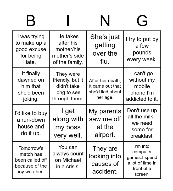 This bingo card has 16 words: You can always count on Michael in a crisis., Don't use up all the milk - we need some for breakfast., She’s just getting over the flu., I was trying to make up a good excuse for being late., I'd like to buy a run-down house and do it up., He takes after his mother/his mother's side of the family., My parents saw me off at the airport., They are looking into causes of accident., It finally dawned on him that she'd been joking., They were friendly, but it didn't take long to see through them., Tomorrow's match has been called off because of the icy weather., I try to put by a few pounds every week., I get along with my boss very well., I can't go without my mobile phone.I'm addicted to it., After her death, it came out that she'd lied about her age. and I'm into computer games.I spend a lot of time in front of a screen..