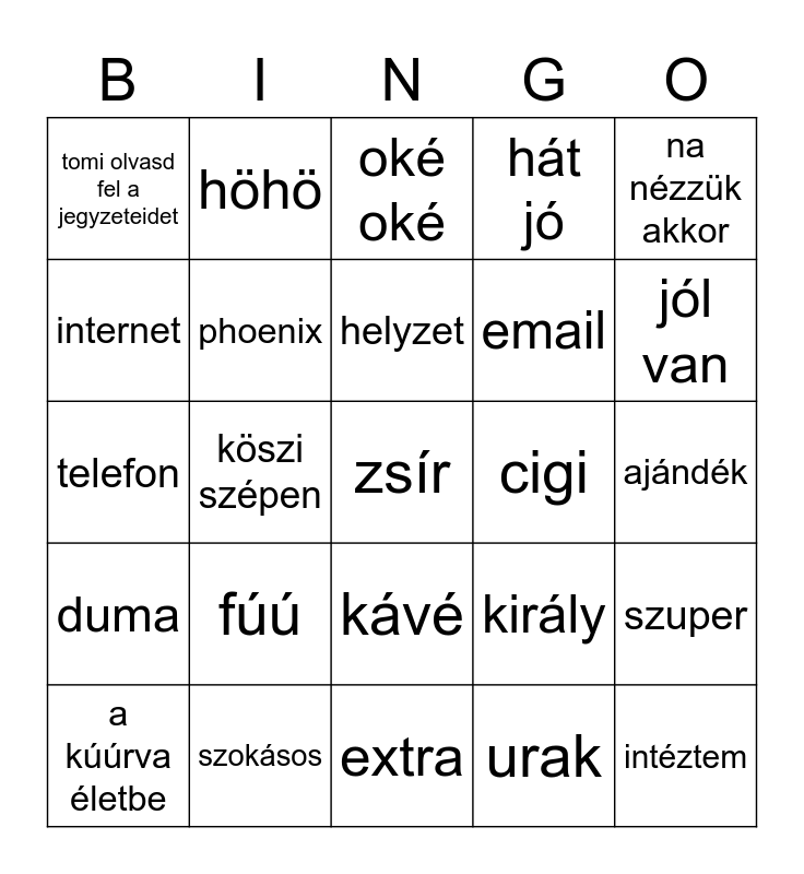 This bingo card has 25 words: fúú, extra, helyzet, a kúúrva életbe, na nézzük akkor, tomi olvasd fel a jegyzeteidet, internet, höhö, cigi, kávé, email, telefon, király, szuper, phoenix, intéztem, ajándék, oké oké, jól van, köszi szépen, zsír, szokásos, duma, hát jó and urak.