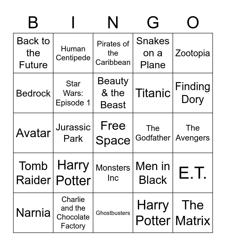 This bingo card has a free space and 24 words: Harry Potter, Charlie and the Chocolate Factory, Beauty & the Beast, Narnia, Zootopia, Back to the Future, Bedrock, Human Centipede, The Godfather, Monsters Inc, Titanic, Avatar, Men in Black, E.T., Star Wars: Episode 1, Harry Potter, The Avengers, Pirates of the Caribbean, Finding Dory, Jurassic Park, The Matrix, Tomb Raider, Snakes on a Plane and Ghostbusters.