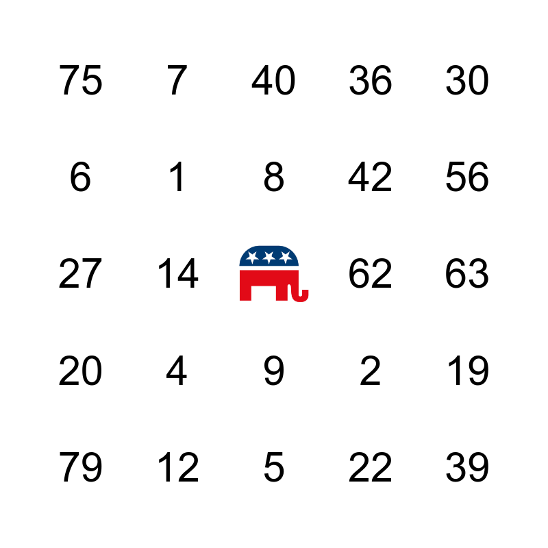 This bingo card has a free space and 24 words: 4, 12, 8, 79, 30, 75, 6, 7, 62, 9, 42, 27, 2, 19, 1, 22, 63, 40, 56, 14, 39, 20, 36 and 5.