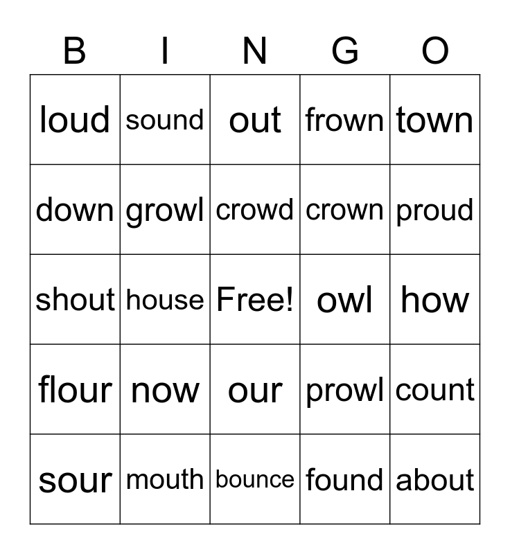 This bingo card has a free space and 24 words: now, mouth, crowd, sour, town, loud, down, sound, owl, our, crown, shout, prowl, count, growl, found, how, out, proud, house, about, flour, frown and bounce.