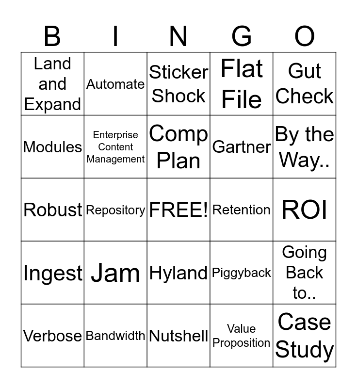 This bingo card has a free space and 24 words: Jam, Bandwidth, Comp Plan, Verbose, Gut Check, Land and Expand, Modules, Automate, Retention, Hyland, Gartner, Robust, Piggyback, Going Back to.., Enterprise Content Management, Value Proposition, ROI, Sticker Shock, By the Way.., Repository, Case Study, Ingest, Flat File and Nutshell.