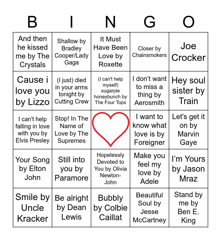 This bingo card has a free space and 89 words: Can’t Take my Eyes Off You by Frankie Valli, Just the way you are by Bruno Mars, Hopelessly Devoted to You by Olivia Newton-John, Ain’t No Mountain High Enough by Marvin Gaye, I Will Always Love You by Whitney Houston, Crazy in Love by Beyonce and Jay Z, Our Song by Taylor Swift, You Belong with Me by Taylor Swift, Halo by Beyonce, Call Me Maybe by Carly Rae Jepson, Perfect by Ed Sheeran, What Makes You Beautiful by One Direction, I’m Yours by Jason Mraz, Let's get it on by Marvin Gaye, You lost that loving feeling by Righteous Brothers, (I can't help myself) sugarpie honeybunch by The Four Tops, L-O-V-E- by Nat King Cole, This magic moment by The Dirfters, At Last by Etta James, Kiss on My List by Hall and Oates, Everything by Michael buble, A thousand miles by Vanessa Carlton, Bubbly by Colbie Caillat, Angel by Shaggy, I can't help falling in love with you by Elvis Presley, Be alright by Dean Lewis, Love Me Do by The Beatles, Let my love open the door by Pete Townsend, If I Ain’t Got You by Alicia Keys, Lets Marvin Gaye and get it on by Charlie Puth, Closer by Chainsmokers, Stop! In The Name of Love by The Supremes, Perfect by One direction, And then he kissed me by The Crystals, Seven Things by Miley Cyrus, It Must Have Been Love by Roxette, Cause i love you by Lizzo, Take My Breath Away by Berlin, Hey soul sister by Train, Smile by Uncle Kracker, Your Song by Elton John, Thinking out loud by Ed sheeran, My Girl by The Temptations, Time after Time by Cyndi Lauper, Make you feel my love by Adele, I want to know what love is by Foreigner, We found love by Rihanna, Chasing cars by Snow patrol, Love Bug by Jonas Brothers, Shallow by Bradley Cooper/Lady Gaga, Pour some sugar on me by Def Leopard, (I’ve had) The Time of My Life by Bill Medley, I got you babe by Sonny and Cher, All of me by John Legend, Love story by Taylor Swift, My Heart will go on by Celine Dion, When a man loves a Woman by Percy Sledge, We belong together by Mariah Carey, You're Beautiful by James blunt, Sugar by Maroon 5, Sugar Sugar by The Archies, Where is the Love? by Black eyed peas, My Love by Justin TImberlake, Love you like a love song by Selena Gomez, Super Bass by Niki Minaj, The one that got away by Katy Perry, Heart attack by Demi lovato, The Way by Ariana Grande, You’re The One That I want from Grease, Still into you by Paramore, Stand by me by Ben E. King, Signed, Sealed, Delivered I’m Yours by Stevie Wonder, Like a Prayer by Madonna, I don’t want to miss a thing by Aerosmith, (I just) died in your arms tonight by Cutting Crew, Beautiful Soul by Jesse McCartney, Yellow by Cold Play, Ain't no other man, Christina Aguilera, You are so beautiful, Joe Crocker, Young and Beautiful, Lana Del Ray, Baby, Justin Beiber, All you need is love by The Beatles, Hey there Deliah by Plain White Ts, Your Body is a Wonderland by John Mayer and Ain’t No Sunshine by Bill Withers.