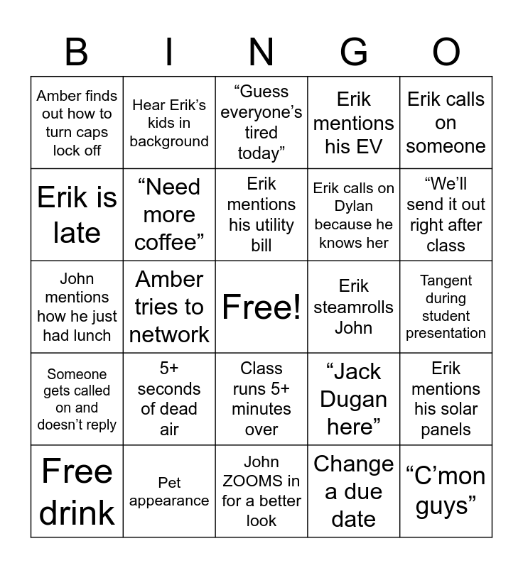 This bingo card has a free space and 29 words: Free drink, Shotgun before you can claim bingo, Amber tries to network, Amber types in all caps, Amber finds out how to turn caps lock off, “Guess everyone’s tired today”, “Need more coffee”, 5+ seconds of dead air, Erik steamrolls John, Pet appearance, Tangent during student presentation, “C’mon guys”, John ZOOMS in for a better look, Change a due date, “We’ll send it out right after class, Jack gets invited to a meeting, Class runs 5+ minutes over, Someone gets called on and doesn’t reply, Erik calls on someone, John mentions how he just had lunch, “Jack Dugan here”, John giggles for 5+ seconds, Erik calls on Dylan because he knows her, Erik is late, Erik mentions his EV, Hear Erik’s kids in background, Erik mentions his solar panels, Erik mentions his utility bill and John pauses because his garage door is opening.