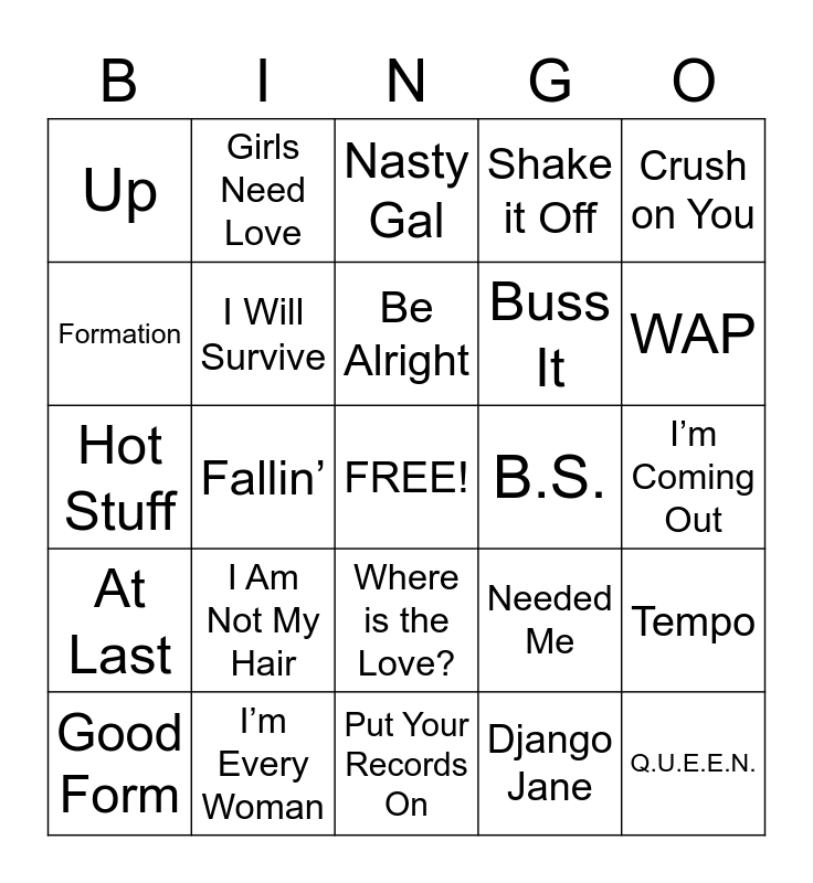 This bingo card has a free space and 46 words: Cranes in the Sky, Q.U.E.E.N., Feeling Myself, Put Your Records On, I Am Not My Hair, Diva, Girls Need Love, Window Seat, Formation, Doo Wop, I Will Survive, Shake it Off, Tempo, Needed Me, Love on the Brain, Anaconda, Be Alright, B.S., Hit My Phone, Crush on You, Fallin’, Django Jane, Up, Buss It, Peng Black Girls Remix, WAP, Good Form, Streets, Where is the Love?, At Last, Respect, What’s Love Got to Do With It, I Will Always Love You, Get Ur Freak On, Truth Hurts, I’m Every Woman, I’m Coming Out, Family Affair, Give me One Reason, Killing me Softly, How Many Licks?, Nasty Gal, Hot Stuff, Shoop, Say My Name and Survivor.