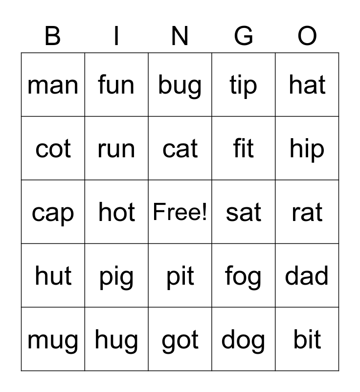 This bingo card has a free space and 24 words: pig, hug, cat, mug, hat, man, cot, fun, sat, pit, fit, cap, fog, dad, run, dog, rat, bug, hip, hot, bit, hut, tip and got.