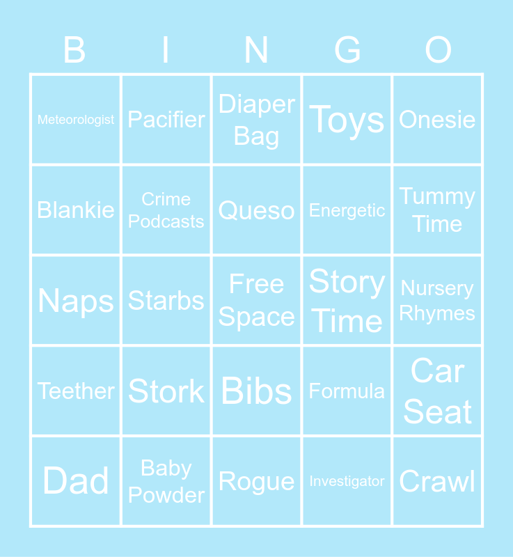 This bingo card has a free space and 64 words: Bottles, Mom Jokes, Wipes, Car Seat, Chipotle, Diapers, Pacifier, Swaddle, Queso, Witty, Bibs, No Sleep!, Nursery Rhymes, Onesie, Crib, Blankie, Starbs, Meteorologist, Mullen, Energetic, Stork, Teether, Toys, Potty Training, Funny, Ravens, Stroller, High Chair, Baby Swing, Night Light, Burp Cloths, Mom, Ultrasound, Mobile, Tummy Time, Dad, Changing Table, Investigator, Aberdeen, Crime Podcasts, Naps, Story Time, Diaper Rash Cream, Baby Monitor, Detective, Crawl, Baby Powder, Sippy Cup, Formula, Fajitas, Humidifier, Ostrich Pillow, Rogue, Sling / Carrier, Teddy Bear, Baby Boy, Diaper Bag, Birthing Ball, Dwight's Beets, Red Flag, Risky Business, Los Portales, ECRM OG and DJ Air Horn.