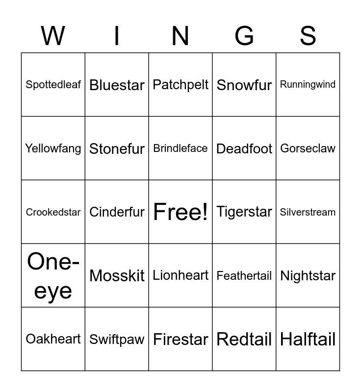 This bingo card has a free space and 26 words: Lionheart, Redtail, Brindleface, Swiftpaw, Runningwind, Spottedleaf, Yellowfang, Bluestar, Silverstream, Feathertail, Deadfoot, Crookedstar, Nightstar, Oakheart, Cinderfur, Willowpelt, Snowfur, One-eye, Patchpelt, Halftail, Gorseclaw, Firestar, Tigerstar, Mosskit, Stonefur and Moonflower.
