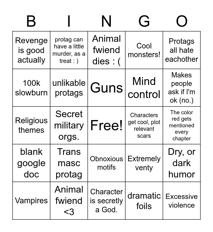 This bingo card has a free space and 24 words: Trans masc protag, Animal fwiend <3, Guns, Vampires, Protags all hate eachother, Revenge is good actually, 100k slowburn, protag can have a little murder, as a treat : ), Characters get cool, plot relevant scars, Obnoxious motifs, Mind control, Religious themes, Extremely venty, Dry, or dark humor, unlikable protags, dramatic foils, The color red gets mentioned every chapter, Animal fwiend dies : (, Makes people ask if I'm ok (no.), Secret military orgs., Excessive violence, blank google doc, Cool monsters! and Character is secretly a God..