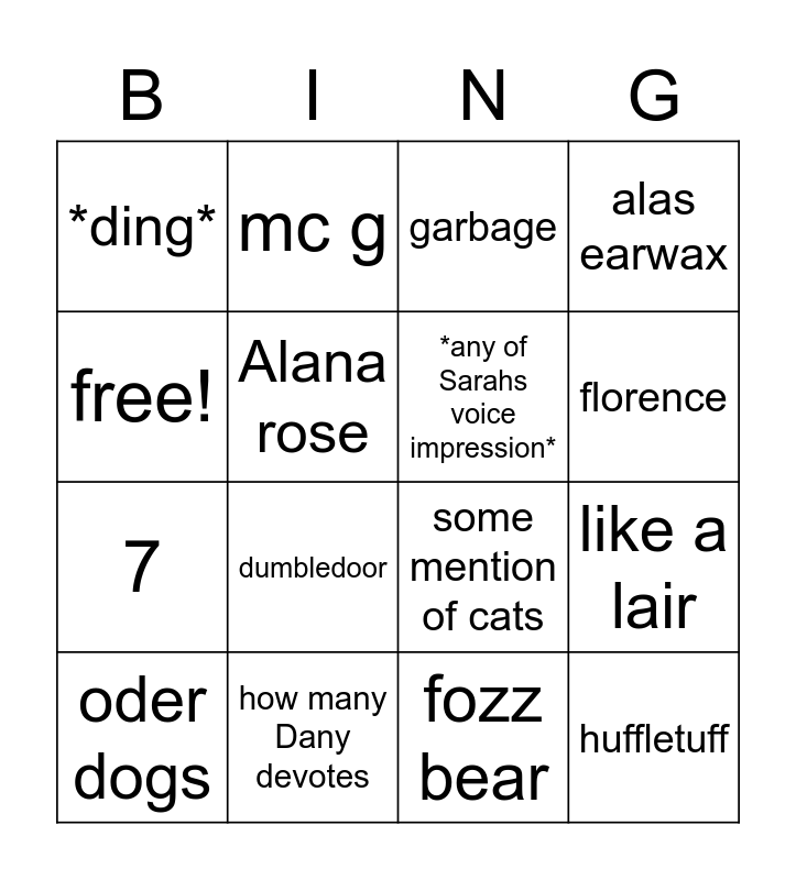 This bingo card has 16 words: how many Dany devotes, like a lair, garbage, *ding*, 7, mc g, some mention of cats, fozz bear, free!, Alana rose, oder dogs, alas earwax, dumbledoor, florence, *any of Sarahs voice impression* and huffletuff.