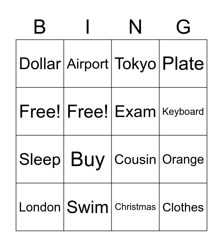This bingo card has 16 words: Swim, Orange, Tokyo, Dollar, Sleep, Airport, Cousin, Christmas, Free!, Free!, London, Plate, Buy, Keyboard, Exam and Clothes.