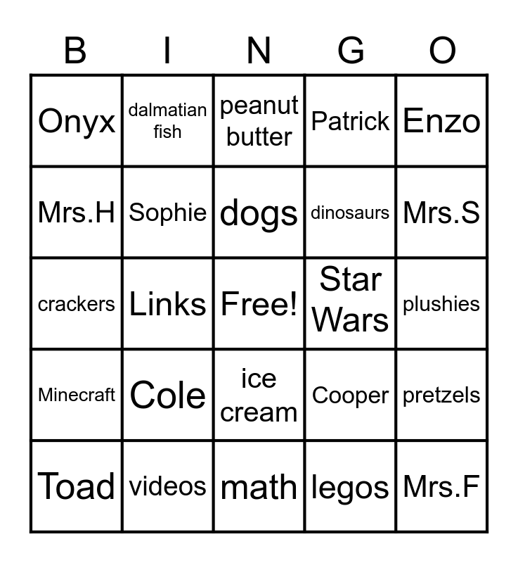 This bingo card has a free space and 24 words: Cole, videos, dogs, Toad, Enzo, Onyx, Mrs.H, dalmatian fish, Star Wars, ice cream, dinosaurs, crackers, Cooper, pretzels, Sophie, legos, plushies, peanut butter, Mrs.S, Links, Mrs.F, Minecraft, Patrick and math.