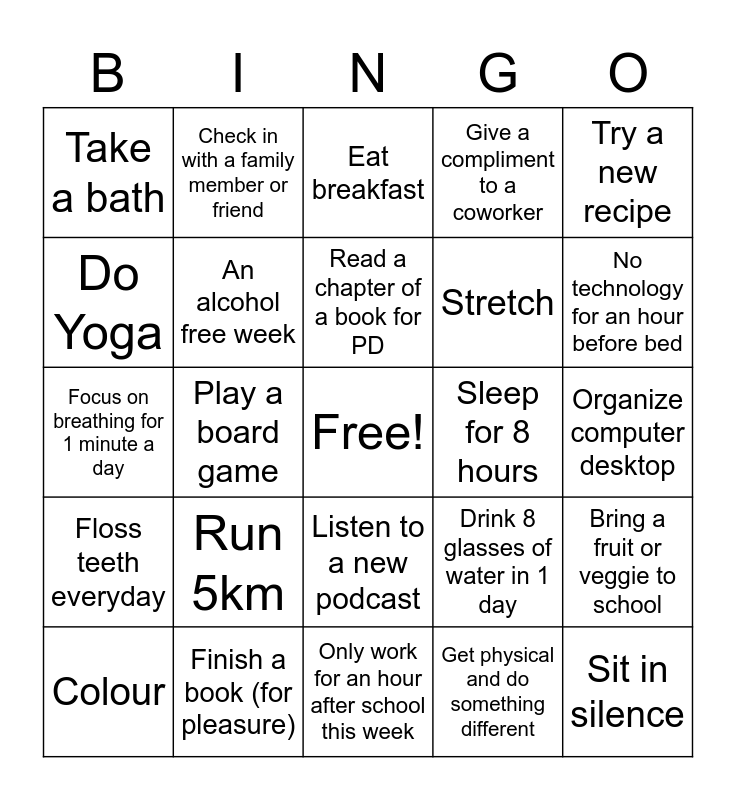 This bingo card has a free space and 24 words: Run 5km, Finish a book (for pleasure), Read a chapter of a book for PD, Colour, Try a new recipe, Take a bath, Do Yoga, Check in with a family member or friend, Sleep for 8 hours, Listen to a new podcast, Stretch, Focus on breathing for 1 minute a day, Drink 8 glasses of water in 1 day, Bring a fruit or veggie to school, An alcohol free week, Get physical and do something different, Organize computer desktop, Eat breakfast, No technology for an hour before bed, Play a board game, Sit in silence, Floss teeth everyday, Give a compliment to a coworker and Only work for an hour after school this week.