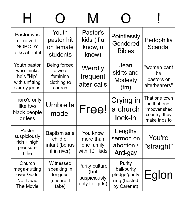 This bingo card has a free space and 24 words: Baptism as a child or infant (bonus if in river), Witnessed speaking in tongues (unsure if fake), Weirdly frequent alter calls, Church mega-nutting over Gods Not Dead The Movie, Pedophilia Scandal, Pastor was removed, NOBODY talks about it, Youth pastor who thinks he's "Hip" with unfitting skinny jeans, Youth pastor hit on female students, Crying in a church lock-in, You know more than one family with 10+ kids, Jean skirts and Modesty (tm), There's only like two black people or less, Lengthy sermon on abortion / Anti-gay, You're "straight", Being forced to wear feminine clothing to church, Purity ball/purity pledge/purity ring (hosted by Carenet), That one town in that one ‘impoverished country’ they make trips to, Pastor's kids (if u know, u know), ''women cant be pastors or alterbearers'', Umbrella model, Eglon, Pastor suspiciously rich + high pressure tithe, Pointlessly Gendered Bibles and Purity culture (but suspiciously only for girls).