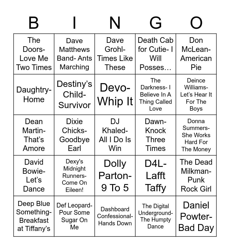 This bingo card has 27 words: D4L- Lafft Taffy, Daniel Powter- Bad Day, The Darkness- I Believe In A Thing Called Love, Dashboard Confessional- Hands Down, Daughtry- Home, Dave Grohl- Times Like These, Dave Matthews Band- Ants Marching, David Bowie- Let’s Dance, Dawn- Knock Three Times, The Dead Milkman- Punk Rock Girl, Dean Martin- That’s Amore, Death Cab for Cutie- I Will Posses…, Deep Blue Something- Breakfast at Tiffany’s, Def Leopard- Pour Some Sugar On Me, Deince Williams- Let’s Hear It For The Boys, Demi Lovato- Really Don’t Care, Destiny’s Child- Survivor, Devo- Whip It, Dexy's Midnight Runners-Come On Eileen!, The Doors- Love Me Two Times, Donna Summers- She Works Hard For The Money, The Digital Underground- The Humpty Dance, Dixie Chicks- Goodbye Earl, DJ Khaled- All I Do Is Win, Dolly Parton- 9 To 5, Don McLean- American Pie and Don Henley- The Boys of Summer.