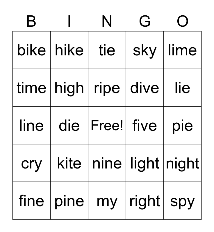 This bingo card has a free space and 24 words: kite, pine, ripe, fine, lime, bike, time, hike, five, nine, dive, line, light, night, high, right, pie, tie, lie, die, spy, cry, sky and my.
