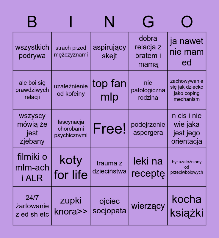 This bingo card has a free space and 24 words: koty for life, zupki knora>>, top fan mlp, 24/7 żartowanie z ed sh etc, ja nawet nie mam ed, wszystkich podrywa, ale boi się prawdziwych relacji, strach przed mężczyznami, podejrzenie aspergera, trauma z dzieciństwa, nie patologiczna rodzina, wszyscy mówią że jest zjebany, leki na receptę, był uzależniony od przeciwbólowych, uzależnienie od kofeiny, wierzący, n cis i nie wie jaka jest jego orientacja, aspirujący skejt, zachowywanie się jak dziecko jako coping mechanism, fascynacja chorobami psychicznymi, kocha książki, filmiki o mlm-ach i ALR, dobra relacja z bratem i mamą and ojciec socjopata.