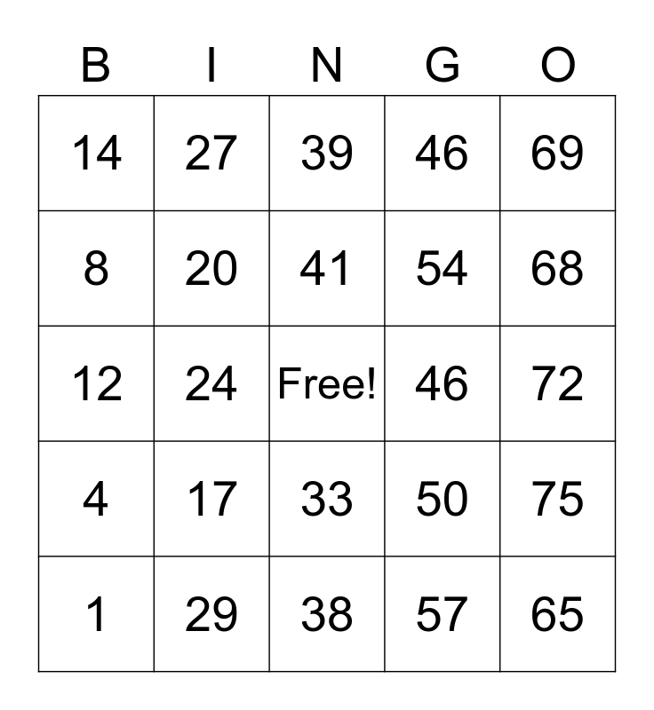 This bingo card has a free space and 24 words: 1, 17, 41, 57, 69, 14, 27, 39, 46, 72, 12, 20, 50, 75, 8, 29, 38, 46, 68, 4, 24, 33, 54 and 65.