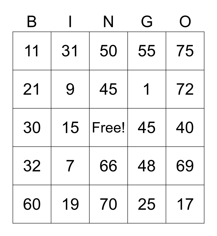 This bingo card has a free space and 24 words: 7, 19, 45, 60, 75, 11, 21, 31, 45, 66, 1, 30, 48, 69, 9, 25, 40, 50, 72, 15, 17, 32, 55 and 70.