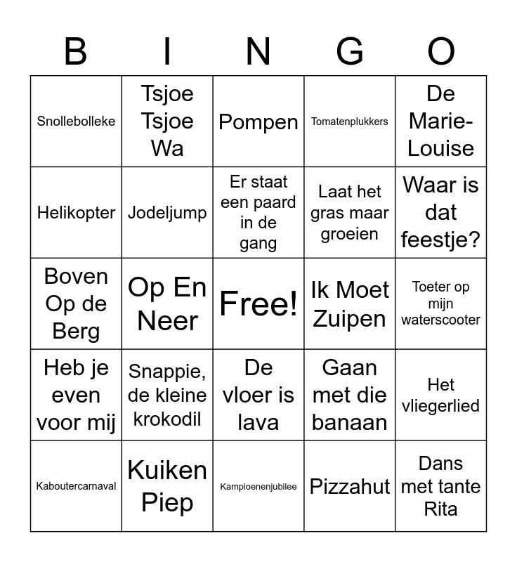 This bingo card has a free space and 24 words: Snappie, de kleine krokodil, Kuiken Piep, Er staat een paard in de gang, Kaboutercarnaval, De Marie-Louise, Snollebolleke, Helikopter, Tsjoe Tsjoe Wa, Ik Moet Zuipen, De vloer is lava, Laat het gras maar groeien, Boven Op de Berg, Gaan met die banaan, Het vliegerlied, Jodeljump, Pizzahut, Toeter op mijn waterscooter, Pompen, Waar is dat feestje?, Op En Neer, Dans met tante Rita, Heb je even voor mij, Tomatenplukkers and Kampioenenjubilee.