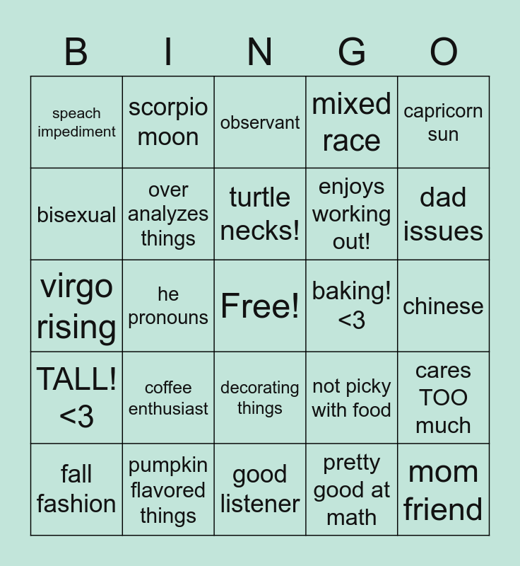 This bingo card has a free space and 24 words: coffee enthusiast, pumpkin flavored things, turtle necks!, fall fashion, capricorn sun, speach impediment, bisexual, scorpio moon, baking!<3, decorating things, enjoys working out!, virgo rising, not picky with food, cares TOO much, over analyzes things, pretty good at math, chinese, observant, dad issues, he pronouns, mom friend, TALL!<3, mixed race and good listener.