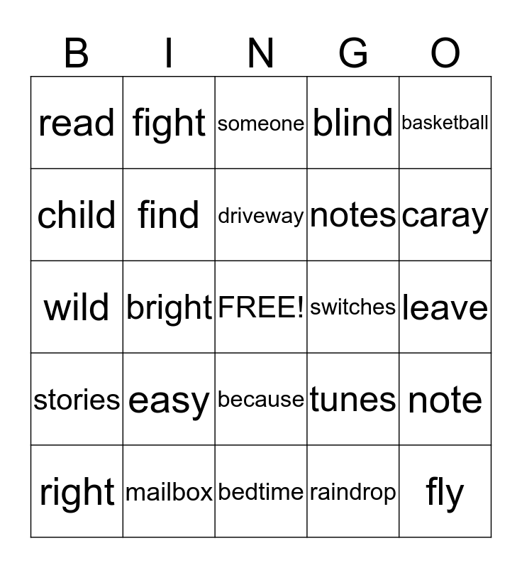 This bingo card has a free space and 74 words: seal, told, someone, cry, hotter, wheel, slow, bedtime, right, happier, party, float, driveway, child, smaller, bright, right, caray, child, wild, find, fight, blind, sky, fly, spider, myself, night, buy, their, basketball, weekend, birthday, bathtub, driveway, raindrop, someone, something, riverbank, backyard, bedtime, mailbox, outside, everybody, sometimes, read, feet, easy, deep, seat, party, wheel, leave, windy, sleep, teeth team, because, Easter, guess, note, notes, story, stories, switch, switches, lunch, lunches, tune, tunes, baby, babies, pennies, scared and people.
